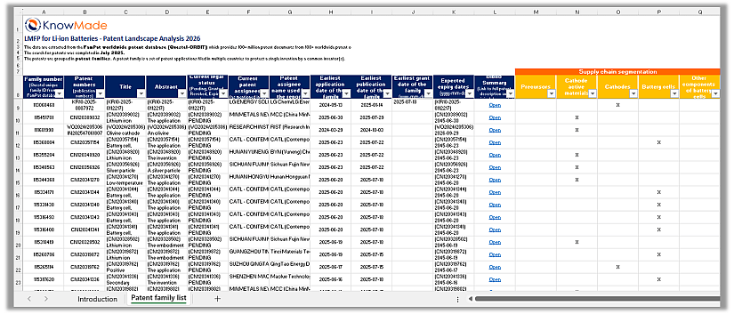 This report also includes an extensive Excel database with all patents analyzed in this study, including patent information (numbers, dates, assignees, title, abstract, etc.), hyperlinks to an updated online database (original documents, legal status, etc.), and supply chain segments (precursors, cathode active materials, cathodes, battery cells).