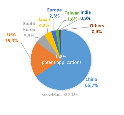 According to KnowMade’s latest IP intelligence, over 65% of all new patent families (inventions) related to RF front-end modules (RF FEM) published in Q1 2025 were filed in China, making it the most active jurisdiction globally. The United States followed with 19.4%, while South Korea and Japan accounted for 5.5% and 4.2% respectively. China’s dominance is now both quantitative and strategic, reflecting a long-term push for self-reliance and technology leadership.